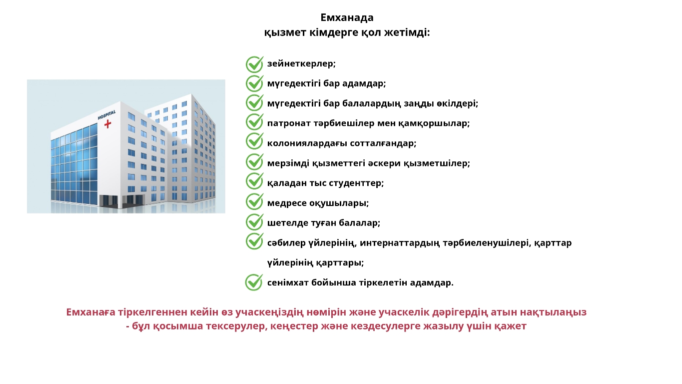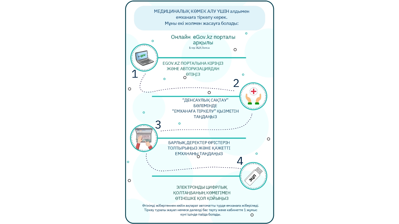 Медициналық көмек алу үшін алдымен емханаға тіркелу керек. Мұны екі жолмен жасауға болады: