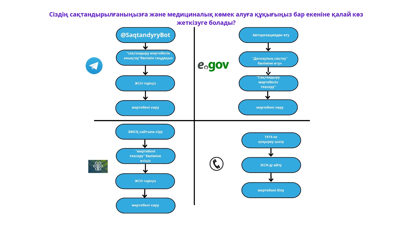 Ботты табыңыз: @SaqtandyryBot (FSMS боты), «Сақтандыру мәртебесін анықтау» бөлімін таңдаңыз, ЖСН енгізіңіз және күйді қараңыз: сақтандырылған/сақтандырылған емес.
